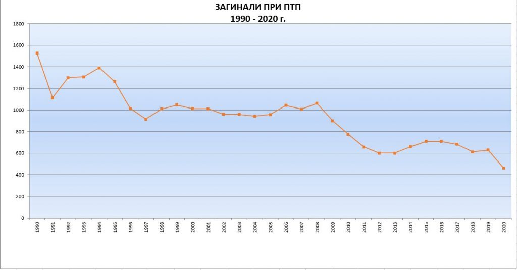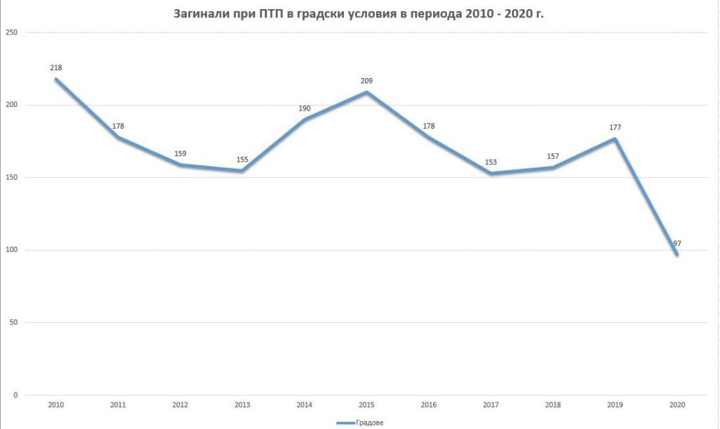 С над 50% е намалял броят на загиналите при пътнотранспортни произшествия в градовете през 2020 г., въпреки че трафикът се е увеличил. Това съобщи Малина Крумова, председател на Държавна агенция „Безопасност на движението по пътищата“ (ДАБДП) в сутрешния блок на БТВ. Тя посочи, че по данни на Столична община интензивността на трафика по натоварените кръстовища в София през втората половина на изминалата година е отбелязал ръст от 20%.
